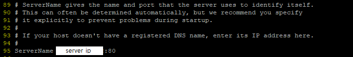 95번째 줄의 ServerName을 주석 해지하고 ServerIP:80 으로 작성후 저장한다.