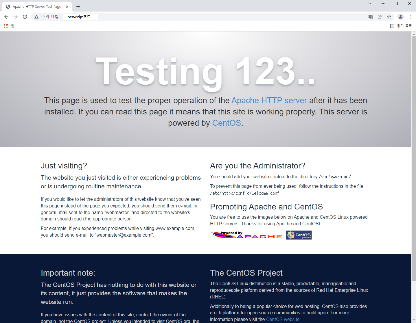 별도의 .html 생성 필요 없이 설정을 마치고 인터넷 주소창에 ServerIP:포트 작성 후 접속하면 아래와 같은 화면이 뜨는걸 볼 수 있다.