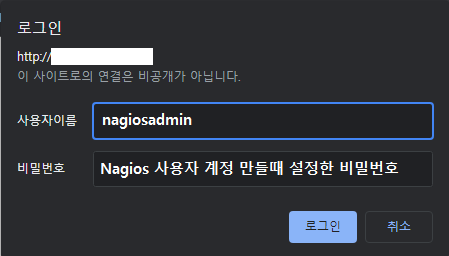 웹에서 IP/nagios 혹은 IP:80포트/nagios 로 접속 시도
