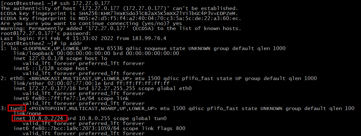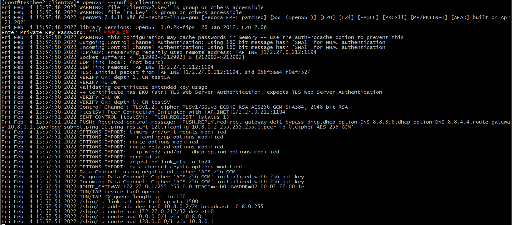 # 접속 후 클라이언트(리눅스 서버2)가 OpenVPN 서버에 제대로 연결 됐는지 확인