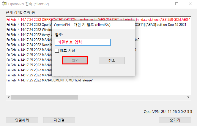 9. 아래와 같은 화면이 뜬다면 설정한 비밀번호를 입력 후 확인을 누른다