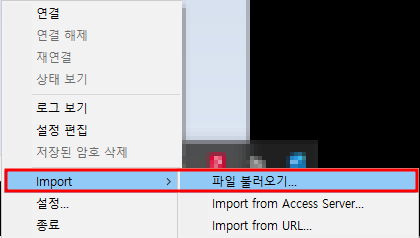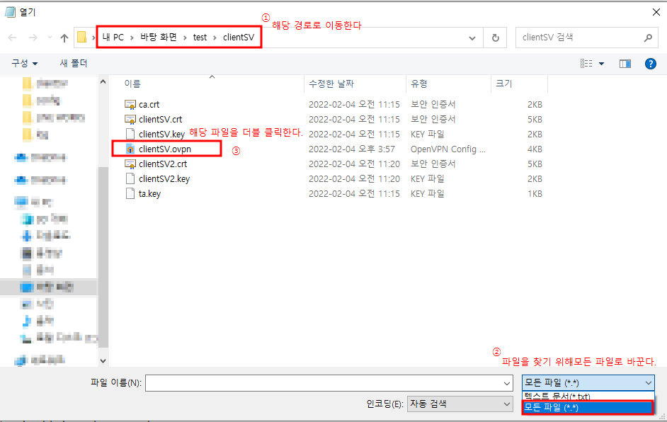 2. 파일 - 열기를 이용하여 백업용으로 남겨두었던 클라이언트명.ovpn을 연다.