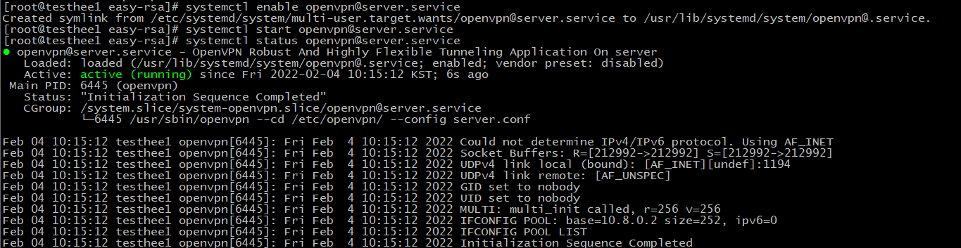 7. openvpn --config 클라이언트명.ovpn 을 치면 아래와 같은 화면이 나온다.