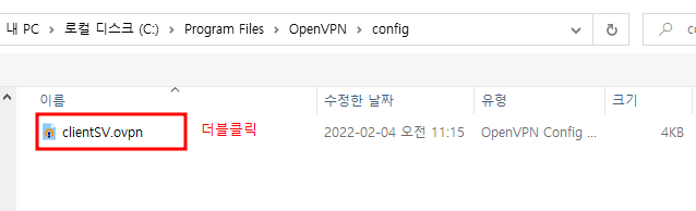7. C:\Program Files\OpenVPN\config 경로에서 클라이언트명.ovpn 더블클릭