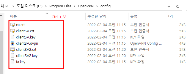 3. 복사한 파일을 C:\Program Files\OpenVPN\config 경로에 붙여넣는다