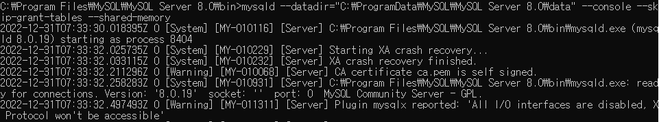 mysqld --datadir="C:\ProgramData\MySQL\MySQL Server 8.0\data" --console --skip-grant-tables --shared-memory