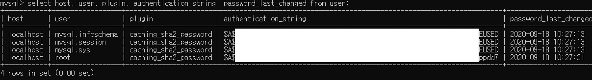 select host, user, plugin, authentication_string, password_last_changed from user;